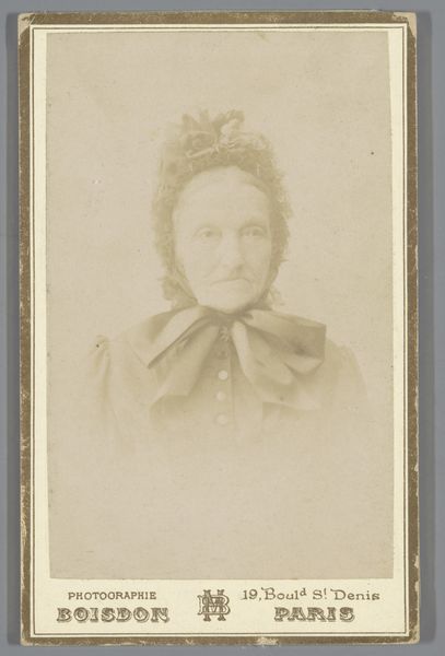 Editor: Here we have "Portrait of an Unknown Woman" a gelatin silver print by Louis Marie Colas, dated between 1886 and 1896. There's a certain stillness to the composition that strikes me, and the almost monochromatic tones contribute to a solemn mood. What do you see in this piece from a formalist perspective? Curator: The work is fascinating in its use of light and shadow. Observe the way the light gently grazes her face, highlighting the contours of her cheekbones and brow. This interplay of illumination creates depth within a two-dimensional plane. Note also the deliberate composition. How would you describe the balance achieved in the placement of the figure? Editor: I see that she's centered, but the darkness of her dress and high collar is juxtaposed with the very bright dress creating some asymmetrical focal points. It avoids a perfect, static symmetry, and guides the eye. Curator: Precisely. The contrasting textures are critical here. Consider the smooth, almost porcelain quality of her skin against the intricate ruffles of her collar. And the gelatin silver printing process itself – how does its materiality contribute to the work's overall effect? Editor: Well, it gives a sense of timelessness and delicacy, perhaps emphasizing the fleeting nature of a captured moment, like a memory fading over time. Curator: An astute observation. By examining these elements, we are not merely describing the portrait, we are deciphering the visual language the artist employs. Through a careful deconstruction, we understand the complex arrangement that elevates it beyond a mere record. Editor: I hadn't thought about it that way, focusing more on the artistic choices than the subject itself. Curator: Understanding these nuances allows us a richer engagement. We appreciate the carefully constructed reality. Editor: That makes a lot of sense. Thank you for sharing your insights. Curator: It was my pleasure, the formal qualities open exciting layers.