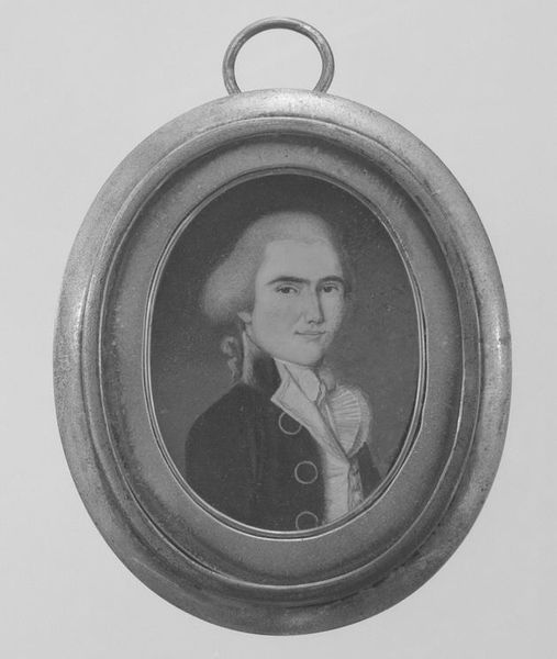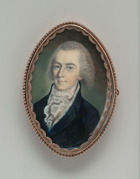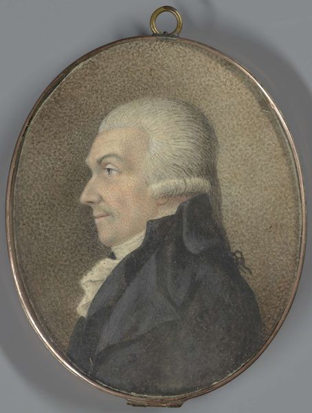 Curator: This striking portrait of Joan Derk van der Capellen tot den Pol dates to between 1784 and 1800 and is attributed to Johan Antonie Kaldenbach. What are your immediate thoughts? Editor: Well, it’s quite formal. Almost… distant. The high collar and tightly composed frame give a sense of rigid social structure, reflecting perhaps the world in which van der Capellen operated. Curator: It's interesting you pick up on that feeling of formality. Miniatures such as this often served very specific purposes, acting almost as portable emblems of status and connection. What do you read from the symbols presented here? Editor: It does seem to be missing the symbols that signal that political project—we’re confronted with the quiet assertion of a gentleman of the era rather than any radical elements that might make his political cause explicitly clear. It seems muted by presentation. Curator: Indeed. Van der Capellen was a significant political thinker during a time of great social upheaval in the Netherlands, and while the portrait itself doesn’t broadcast that, consider its function within that context. The image seems like an item circulated amongst allies and those in sympathy with his thinking; an emblem, even. Editor: It’s almost unsettling, the way the frame becomes part of the meaning. It’s not merely decorative but reinforces ideas around enclosure. It emphasizes van der Capellen's position as someone framed by circumstance. Curator: An interesting take, especially given his progressive politics. The symbolism becomes rather rich when you start thinking about this tension: a radical mind contained within a symbol of tradition and order. It almost suggests the limitations, or perhaps the carefully managed presentation, of radicalism itself. Editor: So the quietness of it speaks louder? The painting and its message is so much about who can decode that set of signifiers? It’s intriguing, this sense of hidden layers. Thanks for helping to draw those out. Curator: The pleasure is all mine. It reminds us that portraits, and miniatures in particular, aren't always simple records; they are intricate dialogues between image, context, and intent.