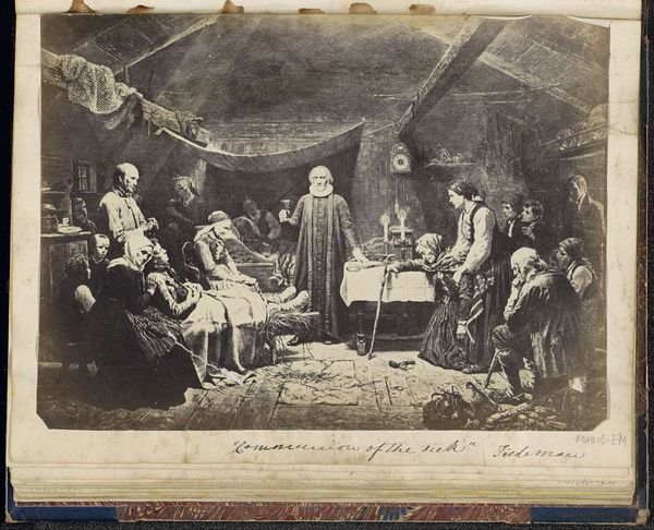 Editor: This is "Schiller at Weimar" by Wilhelm Von Kaulbach, painted in 1913. It’s an oil painting and it strikes me as very theatrical, almost like a stage play. What do you make of its composition? Curator: Indeed. Observe the arrangement of figures—Schiller occupies a central, elevated position, directing attention. Consider the interplay between light and shadow; it sculpts forms and creates a sense of depth. Note also the orthogonals converging towards a vanishing point, constructing a perspectival space. Editor: Yes, there is a defined recession. I notice the somewhat subdued palette too, and how that impacts the overall feeling of the piece. Why this emphasis on pictorial structure? Curator: It underscores the Romantic spirit's focus on harmony and idealized form. The formal elements, the lines and forms, are balanced, contributing to a sense of order and visual coherence. How would you describe the relationship between the figures and the setting? Editor: It seems meticulously arranged. The people aren’t really interacting with each other; they're all arranged for the viewer's benefit. It calls attention to the central figure. Curator: Precisely. Von Kaulbach orchestrates a symbolic stage, emphasizing Schiller's significance through calculated composition. We could interpret the painting as less about a real-life scene, and more about presenting Schiller's enduring influence, a tableau vivant of artistic importance. Editor: That’s interesting, looking at it that way does add another dimension to how I interpret the work. Curator: Exactly, and reflecting upon such arrangements unveils the ideological frameworks that constitute the very fabric of aesthetic appreciation.