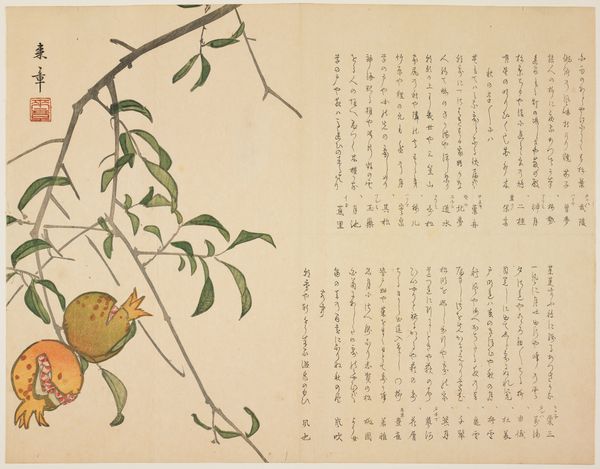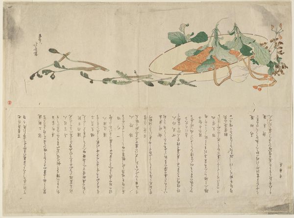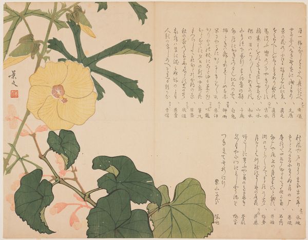 Editor: This is Nakajima Raisho's "Roses of Sharon," made sometime between 1820 and 1859. It's a watercolor and ink print, so delicate. The text that surrounds the rose draws my eye – what’s your first impression of how the visual and the written language relate? Curator: The presence of text *as* image, and image *with* text, immediately establishes the integration of word and world, something central to an iconographer’s view. Think of medieval illuminated manuscripts, or even tantric diagrams - script becomes imbued with a powerful presence beyond simple meaning. What feelings does this integration stir in you? Editor: A sense of learnedness and artistry blending effortlessly. It seems almost meditative. Is there a specific significance to roses of Sharon in Japanese art and culture? Curator: Indeed. These roses, often symbols of feminine beauty and transience, appear frequently in ukiyo-e prints and poetry, embodying a poignant, fleeting moment. Here, the plant and poetry elevate the feeling of *mono no aware* – the pathos of things – wouldn't you agree? The imagery hints at larger cycles, the ephemerality of existence. Editor: Definitely, it makes you consider the life cycle and its connection to us. How interesting that flowers are used as symbols that remind us of our limited time here on Earth. Curator: The pairing of image and script is no accident. Both point to a larger human endeavor, connecting through seeing and speaking and marking the world. What lessons do you carry away with you from the encounter with Nakajima’s artwork? Editor: The profound interplay between image and language has made me view it not just as art, but also as a visual poem, speaking about time and beauty in ways words alone cannot. Curator: Precisely. Symbols like the rose invite reflection upon human memory and continuity.