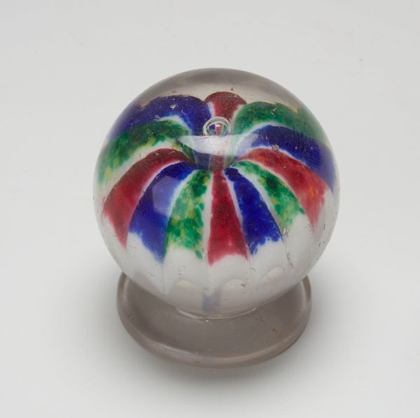 This paperweight was created in Ohio by the Ravenna Glass Company. The weight’s clear glass sphere encases a flurry of colors – white, red, yellow, and blue – suspended in a dance of light and form. Objects like this can be seen as emblems of stability and control in a rapidly changing world. The weight becomes more than functional, offering a sense of stillness. The embedded colors could be seen as a celebration of diversity. Encapsulated, they remind us of the complexities of identity when viewed through different lenses. As you observe the colors mingling in this sphere, think about how the paperweight is both an object of art and a tool of the everyday. It reflects a moment of creativity, and freezes a vibrant microcosm for us to contemplate.