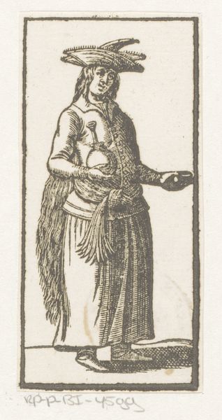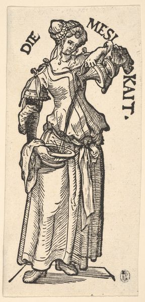 Curator: Here we have a woodcut from 1582 by Melchior Lorck entitled "Kostesælger." Editor: There's such an evocative weight to this figure. You immediately feel the burden she carries, both physically in that massive woven basket and maybe even psychologically, looking at her downward gaze. Curator: Absolutely. Lorck captures this figure within a strong art historical context. He operated within the style of mannerism while producing figural representations, genre scenes and landscapes. In 16th century Europe, we start seeing representations of commoners who are also merchants of some kind, rendered sympathetically. Editor: It's impossible not to read the class dynamics in the image, but I’m also wondering how much of her visual appearance adheres to a visual culture about labor and gender in the period? The head covering suggests modesty or perhaps her lower social status, further highlighted by the oversized basket and rough walking stick. Curator: It makes me think of how deeply embedded commerce was into daily life, particularly for women in that time period. Also think of the fact that the print medium made such imagery so easily available. There's a political element there. Editor: Precisely! And perhaps Lorck is also pushing back against traditional depictions of women in art. Rather than an idealized noblewoman, he gives us the honest, unglamorized portrayal of labor. What might that tell us about his own politics or social consciousness? Or the society he lived in? Curator: I see a clear indication of his perception of society at the time. Her business could have easily been seen as a metaphor of some kind as the woman balances a very heavy burden upon her back. It makes you wonder about a gender reading, as you suggest. Editor: Right, she becomes symbolic beyond her immediate identity, encapsulating broader themes of inequality and endurance. A seemingly simple street vendor embodies deeper socio-economic and perhaps gendered struggles, visualized centuries ago. Curator: It also highlights the ongoing conversation regarding labor, class, and the representations of women, a discussion which reverberates through art history and our contemporary moment. Thank you for those powerful contextual connections. Editor: My pleasure. It is always an enriching dialogue. Thank you for providing context and nuance to these old works so that they can remain ever relevant today.