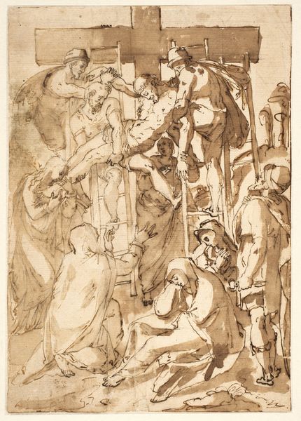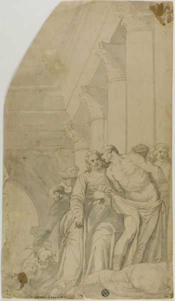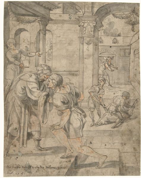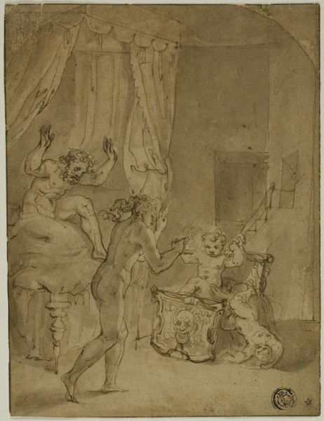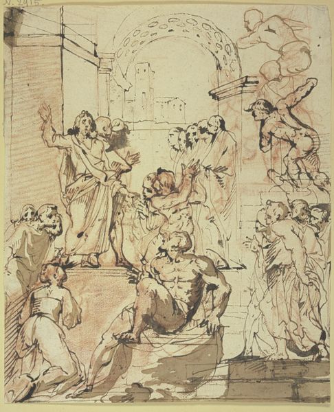 Editor: Here we have "Two Figures Struggling before a King," a drawing in ink on paper by Cesare Nebbia, dating from about 1567 to 1569. It's striking how the energy of the struggle is contrasted by the king's relative calm. What do you see in this piece, especially given its historical context? Curator: Well, from a historical perspective, I see this drawing as a reflection of the political turmoil prevalent during the late Renaissance. Cesare Nebbia worked during a period marked by religious conflict and power struggles. The act of presenting figures struggling before a king inherently raises questions about authority, justice, and social order. Who are these men, and why are they fighting in front of the ruler? Are they challenging his power, or appealing to it? The composition itself directs our attention to the king, but his gestures and facial expressions leave his intent ambiguous, prompting viewers to analyze how power dynamics work. Editor: So, it’s almost like Nebbia is holding a mirror up to society’s power structures. The drawing itself is the question. Curator: Precisely. It asks the viewer to contemplate the role of the monarch and how his decisions, or lack thereof, influence the events around him. Also, we must consider who commissioned this piece, and why. Its public function as a symbol of civic power surely played a role in shaping its artistic choices, wouldn’t you agree? Editor: I hadn’t thought about the commissioner's potential agenda. It makes you wonder about its intended audience and how they might have interpreted it. Thank you! This has given me a totally different perspective. Curator: My pleasure. Remembering that art never exists in a vacuum makes appreciating it so much more meaningful, I think.