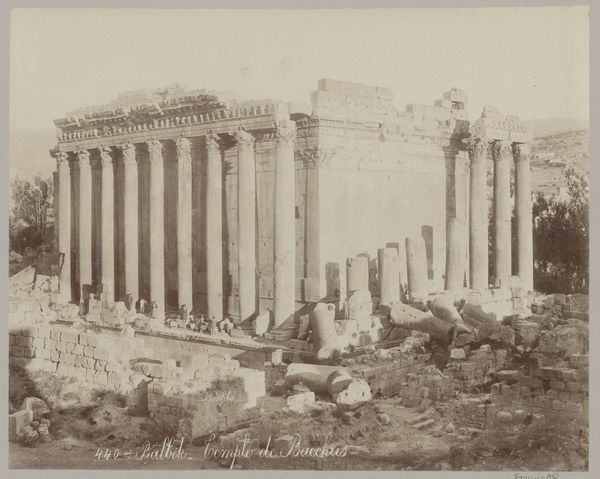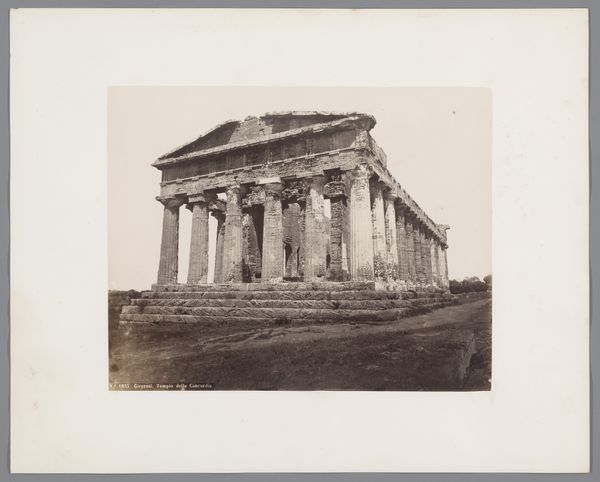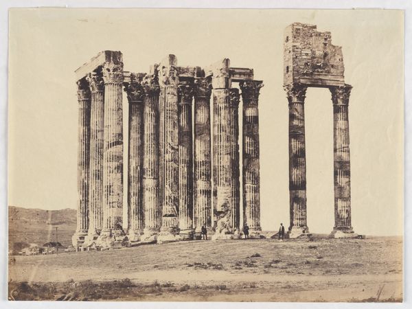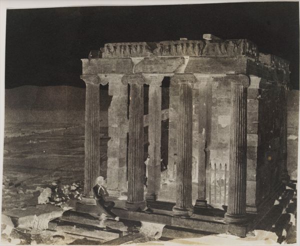 Curator: What strikes me first is the solemnity in this image. Editor: Indeed. This is an albumen print of the Acropolis in Athens, Greece, created by James Robertson between 1850 and 1855. What do you make of his particular choice of process and materials? Curator: Well, the albumen print was a popular photographic process at that time, known for its clarity and detail. But here, it gives the stones a textured, almost palpable presence. You can see the wear and tear on the columns. It underscores the material reality and history embedded in these structures, reminding us of the labor, extraction, and skill that went into the monument's creation. Editor: Absolutely. And it's vital to contextualize this image within 19th-century European interests in Greece, particularly how Classical ideals were mobilized to legitimize contemporary political projects. Seeing the Parthenon framed this way allows us to reflect on colonialism, cultural appropriation, and the power dynamics inherent in the act of representing a colonized space. Curator: Do you think this photograph glamorizes colonialism? It's shot simply in the “landscape” style. Editor: No, I wouldn't say it "glamorizes," but it certainly participates in the visual economy of Orientalism. The ruins signify not just a fallen empire, but a kind of Western triumph, or perhaps inheritance. The perspective offered to Western viewers reinforces their position of power relative to this ancient civilization and the modern Greeks inhabiting this landscape. The very act of Robertson, a British photographer, documenting this scene reflects that power imbalance. Curator: The photograph almost transforms these stones into commodities. What can an analysis of materials, technique, and circulation tell us about the relationship between art, commerce, and cultural capital at this time? The photograph itself is now at the Metropolitan Museum of Art, so what is to be said about that trajectory? Editor: Well, its presence here frames the monument as something for global consumption, separated from its original social and political context in Greece, both then and now. Considering the contemporary Greek perspective—their heritage—complicates how we look at photographs like these. Curator: Right. Thanks for sharing this critical angle. I now see the weight of implications more clearly. Editor: Of course. Considering the Parthenon beyond its artistic value allows us to be far more conscious.