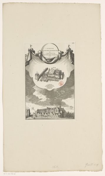 Editor: This print, “Het Sint-Geertruidenklooster te Amsterdam, ca. 1544,” comes to us from an anonymous artist around 1760. The medium is engraving. It has a somewhat surreal feeling, almost like a dream, with the building floating in a cloud above a cityscape. How do you interpret this work? Curator: The artist's construction of pictorial space is compelling. Notice how the engraving is divided into distinct registers. The upper portion, framed by drapery, presents a geometrically precise, almost diagrammatic, rendering of the monastery. In contrast, the lower register offers a more conventionally representational cityscape. Editor: Yes, that sharp contrast is so striking! What do you think the juxtaposition achieves? Curator: The division emphasizes a formal contrast between idealized vision and observable reality. The aerial perspective of the monastery suggests a detached, objective viewpoint, perhaps reflecting Enlightenment ideals of rational observation and categorization. While the city below offers the details and experience of earthly things. The interplay between geometric precision and the more atmospheric rendition below creates a fascinating visual tension. Does this tension give you any insight? Editor: Perhaps it’s showing two perspectives at once? An overview, but also, an intimacy of actually walking through Amsterdam at that time? Thank you for this perspective, it helps to unpack this complicated engraving. Curator: Indeed. By attending to the formal arrangement of the print, we gain insight into its conceptual complexity. It makes me consider ways of seeing itself.