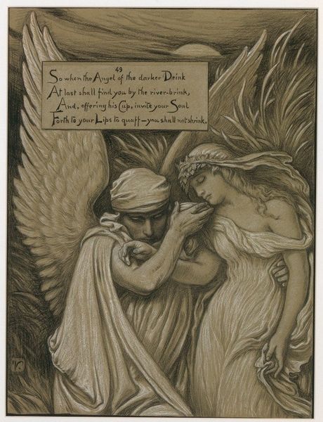This image is "The Soul’s Answer" by Elihu Vedder. Vedder was an American Symbolist painter, illustrator, and poet, active during the late 19th and early 20th centuries. The artwork is an illustration referencing the poem "Rubaiyat of Omar Khayyam" presenting a visual interpretation of its themes. Vedder's personal beliefs, influenced by transcendentalism, spiritualism, and his own exploration of the self, shaped his approach to the poem’s complex questions about existence. Vedder uses symbolism to explore the emotional and psychological states within the poem, rather than adhering to traditional religious narratives. The figures of the angel, the radiant soul, and the face emerging from the darkness represent different aspects of human consciousness. The emotional depth of the artwork lies in its suggestion of the deeply personal nature of spiritual understanding. Vedder transforms the viewer’s experience into an introspective journey. The piece evokes a sense of wonder and introspection about the mysteries of existence, the human condition, and the journey of self-discovery.
