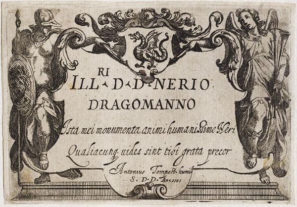 Here is the story: This title page with cartouche was created by Antonio Tempesta around 1591 using etching and engraving. The visual experience is dominated by symmetry and ornate detail, featuring Minerva and Fame flanking a central inscription, all rendered in a precise, linear style that reflects the printmaking techniques of the period. The composition invites us to consider the interplay between classical allegory and humanist dedication. Tempesta employs a visual language steeped in Renaissance symbolism. Minerva, with her armor, represents wisdom and strategic warfare, while Fame, often depicted with wings and a trumpet, symbolizes renown and the spreading of reputation. These figures aren’t merely decorative, they serve as structural supports framing the dedication, suggesting a carefully constructed message. The artwork destabilizes established meanings by merging classical iconography with contemporary portraiture, hinting at the subject's virtues and achievements. In this way, Tempesta uses the formal elements of symmetry and allegory to not just honor an individual but to engage with broader cultural values around knowledge, fame, and legacy. This creates an ongoing dialogue between the artwork and its viewers.