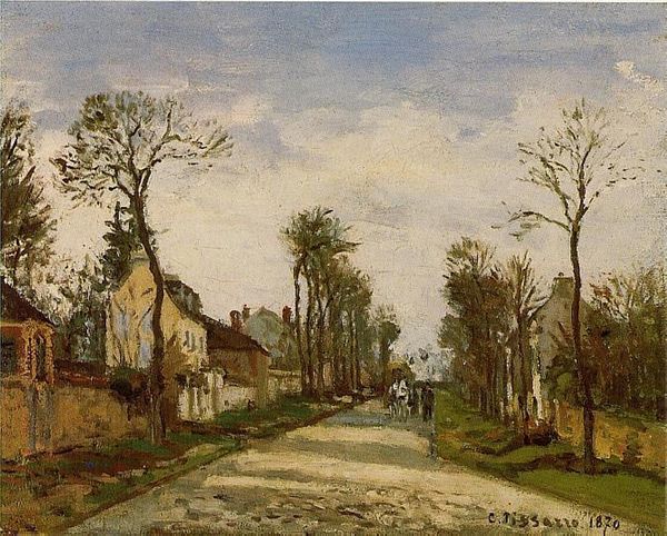 Curator: This is Camille Pissarro’s oil painting, "La Maison De Monsieur Musy, Route De Marly, Louveciennes," dating circa 1872. Editor: Immediately, the overcast sky dominates my perception—it evokes a palpable feeling of melancholy, a quiet observation of rural life perhaps overshadowed by impending weather or, metaphorically, broader societal anxieties. Curator: Observe how Pissarro renders that very sky. See the visible brushstrokes? The broken color? The composition is cleverly divided: a soft horizon line which then pushes upwards into the heavily textured sky. Editor: Exactly. And I'd add that the road itself and the figures travelling it highlight class divisions prevalent in rural France during that period. Were those the landed gentry visiting, or working-class folks going about their difficult lives? Pissarro often presented the unsung heroes and everyday struggles within rural environments. Curator: Note too Pissarro’s use of impasto. That thick application of paint isn’t merely about depiction. It accentuates materiality. He is deliberately reminding us of the paint, the object, the canvas, and its own real texture! Editor: It also creates such depth in its subject matter, bringing that world to our eye. How does this scene contrast, or speak, to the rapidly changing face of France—a rise of industrialization versus idealized pastorial memory? How does it depict a period caught between social ideals? Curator: What you describe gets to the inherent tensions within Impressionism: depicting fleeting moments while implicitly reflecting significant social shifts. Ultimately, it’s a dialogue between what's shown, and the questions such imagery prompts about labor, land ownership, and social justice, all viewed through this very careful, deliberate artistry. Editor: So yes, an aesthetically lovely impressionist work—but one also demanding a layered interpretation given its historical place. A true gem that reveals further secrets when its socio-political context is considered alongside its aesthetic form.
