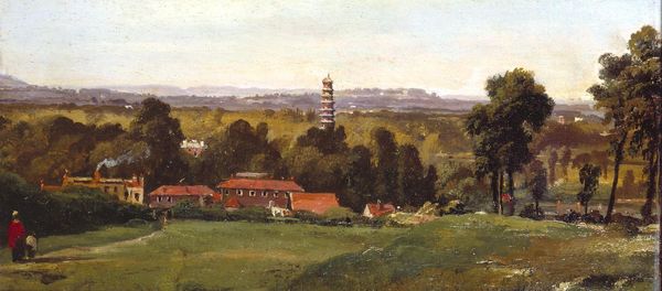 Editor: This is Johann Peter Krafft’s “Blick über den Donaukanal zur Leopoldstadt,” created around 1812, using oil paints. I find the textures quite intriguing – the brushstrokes seem deliberately visible. How do you interpret the scene, thinking about the materials and process Krafft might have used? Curator: Looking at this landscape, I'm drawn to the materiality of the paint itself. Krafft's application of oil paint is not just representational; it's performative. Notice how the thick impasto in the foreground contrasts with the smoother rendering of the distant buildings. What kind of labor would have been involved in preparing and applying the pigments like this? It invites us to consider the economic conditions and artistic training shaping Krafft’s process, no? Editor: That's interesting. I hadn't thought about the economic side of paint application so literally. Do you think there's a conscious element to the variance in detail that implies different societal roles? Curator: Absolutely. Think about who this cityscape was *for*. The level of detail and material investment signal a specific kind of patron – one likely concerned with projecting an image of order and prosperity through a meticulously rendered depiction of their city. It makes you consider the labour used in that project and how much the client saw, let alone cared. Editor: So, the painting functions not just as a visual record but as evidence of a specific material and social relationship? Curator: Precisely. The finished product is inextricably linked to the production methods, from the mining of the pigments to the brushstrokes on the canvas, telling a deeper story about labor and the societal values embedded in 19th-century Vienna. Editor: I guess seeing it that way changes the viewing experience drastically for me; the human involvement is really apparent now!