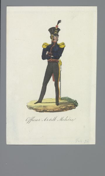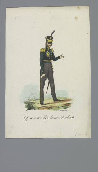 Albertus Verhoesen created this print of an officer of the North Holland Jagers. The composition is dominated by a central figure, meticulously rendered with a balance of color and detail. The officer's uniform, in shades of green and gold, stands out against the muted background, grounding the figure in the composition. Verhoesen’s structured approach creates a certain visual hierarchy. The sharpness of the lines and the clear definition of form reflect an interest in order and representation. The careful detailing of the uniform suggests the importance of identity and status. The print invites consideration of how visual elements—color, line, and form—create meaning. The officer stands not just as a figure, but as a symbol within a structure of cultural and social values. We can examine the formal elements to reveal the layers of meaning embedded within the artwork.