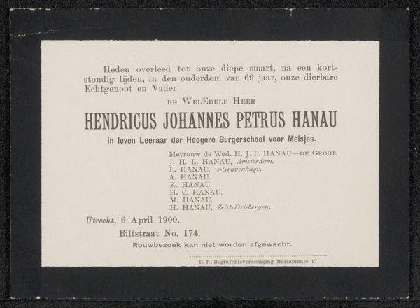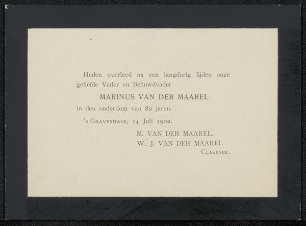 Curator: Here we have an Overlijdensbericht, a death announcement for Willem Maris. Likely created in 1910, this printed poster now resides in the Rijksmuseum's collection. Editor: It strikes me as surprisingly elegant for such a somber piece. The simple paper stock and clean typography, devoid of any embellishment, lends a stark dignity to the announcement. Curator: Agreed. Note the deliberate choice of typography—a formal calligraphy balanced with a straightforward typeface. And its materiality is significant; it’s likely printed in mass for broad distribution. It speaks to the role of printed materials in shaping social rituals. Editor: Precisely. Think of the social dynamics inherent in disseminating such information. The typography dictates a formal, respectful tone and speaks volumes about societal customs and grieving rituals of the era. Also consider the very structure of family, named on this document. Curator: And someone must have designed this. Perhaps a local print shop? The design work here probably reflects local aesthetics and standard printing practices of the day. These posters, or graphic art pieces, can be great examples of craft from that time period. Editor: We also see class subtly expressed. Maris was knighted, which we see on this announcement, marking his family and community position in a society deeply structured around class distinctions and hierarchical rank. Curator: Absolutely, a tangible link to Dutch social history. This isn't just a static image, it's an object involved in the actual practice of mourning and commemoration. Editor: What lingers for me is how this small piece connects to profound emotions—loss, remembrance, familial duty. Curator: Yes, this piece isn't simply announcing a death, it shows how societies have attempted to deal with this phenomenon through process, creation, and distribution of craft and design. Editor: Such objects powerfully remind us how personal grief intersects with broader social and political landscapes. Curator: Agreed. It allows us to appreciate design's presence at all moments, even death.