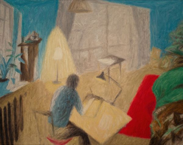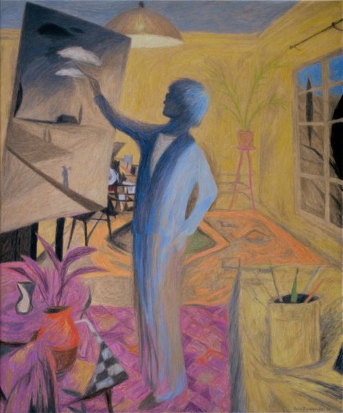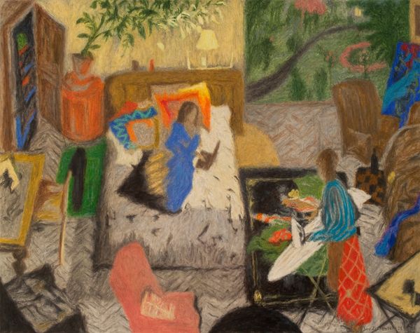 Curator: "Ironing and Painting," a 2021 work by Iwo Zaniewski. It's an acrylic and pastel piece depicting two figures within what seems to be an artist's studio. The interplay of artistic activities is striking here. Editor: Oh, I see that, but my first thought was simply "organized chaos!" Look at that space – canvases leaning, paints everywhere… it’s bursting with creative energy, or maybe just… life. I wonder if Zaniewski's making a tongue-in-cheek statement about the reality of artistic life versus the romanticized ideal? Curator: Possibly, but also consider how the dual activities, ironing and painting, mirror the duality within the creative process. Ironing, representing labor, structure, and routine, stands juxtaposed against the spontaneity and boundless creativity associated with painting. It’s almost alchemical – the mundane transforms the profound. Editor: That’s deep, really interesting. For me it's more visceral. Check out the color palette – the cool blues against the warm reds, yellows, and greens, the kind of saturated colors of childhood. The work feels immediate and almost frenetic…almost anxious? It isn’t neat or comfortable like the Impressionists. More edgy, and dare I say…authentic. Curator: "Authenticity" is a powerful lens to see it through, given that the very composition invokes historical tropes and art history with intimist scenes and self-portraiture as conceptual framing. Yet Zaniewski pushes back with rawer applications reminiscent of street graffiti and spray art techniques. Note the stark lines defining both of the artist figures and interior landscape elements. Editor: The rawness does add such an honesty… The graffiti style lines really help make the case it could be an ironic statement too; like art shouldn’t be pristine all the time to make sense, and be art. It should get its hand dirty. He really merges the supposed "low" with the "high". It’s like, can’t art just be part of our daily lives, blending it? Curator: Exactly. It reflects the collapse of boundaries between what's deemed precious and everyday, mirroring the spirit of our contemporary era. Zaniewski prompts a broader inquiry into how we classify and elevate artistic endeavor in our contemporary lives. Editor: Totally. It feels so relatable too because sometimes you get lost into making the perfect art piece that you forget the "living" aspect about it, when maybe you don’t even have clean clothes, haha! A very human moment captured, indeed!