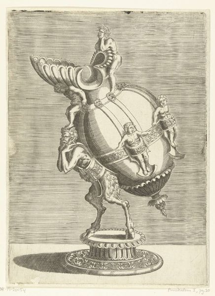 This print, made by Balthazar van den Bos in the 16th century, depicts a fantastical vessel, seemingly crafted from precious metal. The image would have been made using an intaglio printmaking process, where the design is incised into a metal plate, inked, and then transferred to paper under high pressure. Look closely, and you can see the network of fine lines that create the image. These marks define not only the form, but also the reflective quality of the imagined silver or gold. This illusion is entirely dependent on the skill of the engraver. Consider the cultural context: prints like these circulated widely, serving as inspiration for actual three-dimensional objects made by goldsmiths and silversmiths. The design reflects the Mannerist style, with its emphasis on elaborate, muscular figures and inventive ornament. But beyond aesthetics, this print prompts us to consider labor. Though it depicts a luxury object, the print itself was relatively accessible. The knowledge and skill of the artist, combined with the relative affordability of the print medium, democratized access to high design.