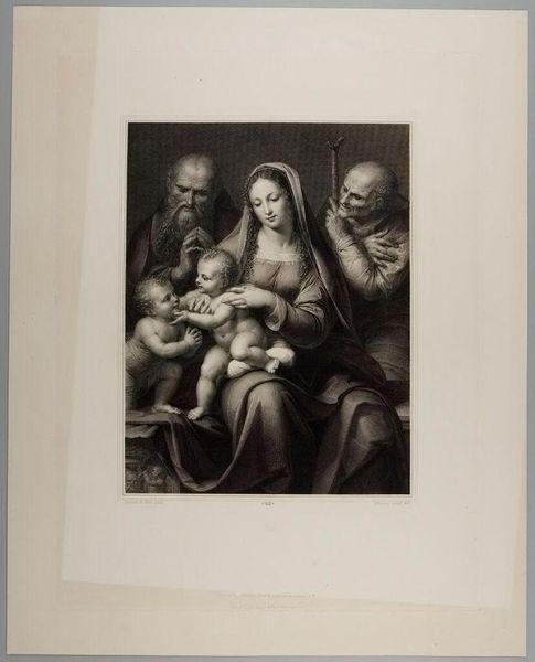 Curator: Let's discuss "Holy Family" attributed to Ludwig Albert Montmorillon, currently residing in the Harvard Art Museums. Editor: My first impression is one of serene intimacy, almost a hushed reverence conveyed through the careful arrangement of figures and the subtle tonal gradations. Curator: The composition is fascinating. Note how the figures are closely grouped, their forms creating a pyramidal structure that lends stability and visual harmony. The artist plays with light and shadow to define each form, almost a chiaroscuro effect, enhancing the dimensionality. Editor: And the halos! They're simple circles, but they instantly communicate the sacred nature of this gathering, echoing centuries of artistic tradition while suggesting divine light and grace. Curator: Precisely. The linear precision and the almost mathematical balance achieved through the placement of each figure suggest an adherence to classical ideals, albeit softened with a touch of emotional warmth. Editor: It strikes me how these symbolic choices reinforce the familial bond depicted, creating a potent image of love and devotion. I find myself drawn into their silent story. Curator: Indeed, a compelling study in form meeting iconography. Editor: Absolutely. A wonderful example of how technique and symbolism converge to create meaning.