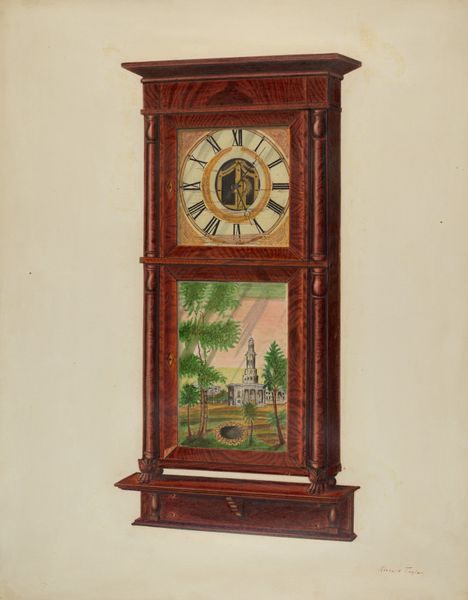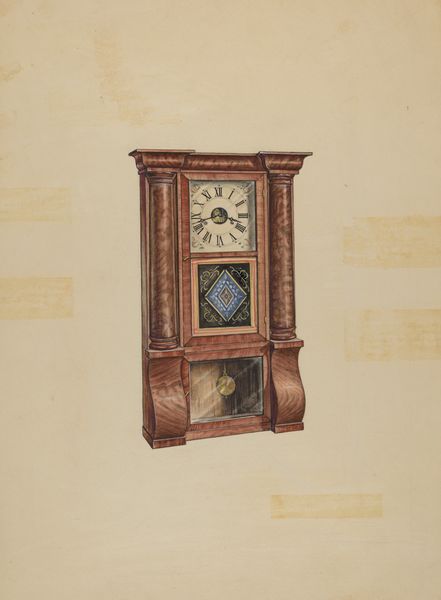Editor: Here we have Alvin M. Gully's "Empire Mirror" from 1936, seemingly a watercolor and drawing piece. It’s… peculiar. The rendering of the mirror itself seems almost hazy, while the frame possesses crisp details. How would you approach an interpretation of this work? Curator: Considering its formal elements, I observe a clear emphasis on verticality. The artist uses the elongated rectangular form to guide the viewer's eye upward. Note how the detailed carving on the frame contrasts with the diffused, almost ethereal quality of the mirror's reflection. This deliberate contrast introduces a play between the tangible and intangible, the solid and the ephemeral. What strikes you about that diamond shape? Editor: Well, the ornate crest in the blue diamond does add a layer of visual intrigue, breaking the vertical pull, it almost centers your attention back to the upper portion. Curator: Precisely. It functions as a focal point, interrupting the linear flow and encouraging a closer inspection of its symbolic weight. Observe, too, how the geometric regularity of the diamond contrasts with the more organic forms within. Editor: It's as if the artist wanted us to study the individual elements, contrasting textures and geometric shapes. Curator: It demonstrates an awareness of line, form, texture and contrast as a set of signifying gestures. It would be interesting to explore further why these choices might have been made. Editor: I’m struck by how a seemingly simple object can hold so many layers of artistic intention. It challenges me to look beyond the subject matter and focus on the artist’s conscious choices. Curator: Indeed, a meticulous focus on the artistic decisions within a composition is, in my view, often the path to more meaningful understanding.