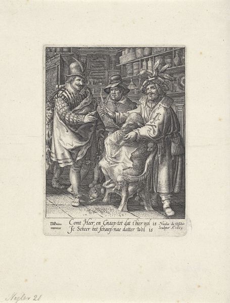 This small, circular print, “Netdroogster,” presents a scene rendered with meticulous lines, likely dating from the 17th century. The composition centres on a woman seated indoors, attended by a man, with their figures framed by a curving inscription that mirrors the print's circular edge. The use of light and shadow, achieved through dense hatching, creates a textured surface. The engraving employs a semiotic system of signs where domestic elements – a table, a curtain, and a small animal – function as cultural codes. The inscription encircling the image acts as a linguistic frame, inviting the viewer to decode the relationship between text and image. The artist challenges the viewer to interpret the power dynamics at play, destabilizing fixed meanings through composition and form. The work creates a space for ongoing interpretation by engaging with broader philosophical concerns about the nature of seeing and knowing.