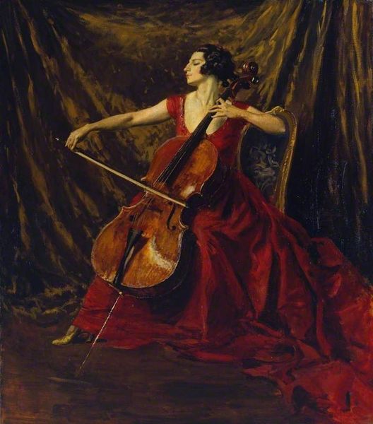 Editor: So, here we have Elihu Vedder’s "Girl With a Lute," painted in 1866 using oil paints. There's something so still and introspective about it...almost like she's listening to a song only she can hear. How do you read this painting? Curator: It’s interesting that you mention "listening," because, honestly, I don’t ‘read’ it, I *feel* it. Like a memory that's just out of reach. Look at how the muted colours and soft lighting almost make her blend into the tapestry behind her. Vedder wasn't just painting a portrait, but evoking a mood, a sensation. He’s using a specific composition and lighting to explore this feeling. Editor: I see what you mean! She does seem almost part of the wallpaper. Was Vedder intentionally blurring the lines between the figure and the background? Curator: Absolutely! Vedder, like many artists of his time, was deeply interested in conveying emotions through symbolic means. Her somewhat melancholic gaze combined with that gigantic lute speaks of something more profound. Tell me, what comes to your mind when you see the Lute? Is it solely a musical instrument? Editor: Hmmm... more than an instrument, maybe a symbol of lost loves, a creative pursuit, or the inner self... I'm still an undergraduate... it's all quite intuitive. Curator: Haha, intuitions are underrated, aren't they? And if a piece makes you ask such open, generous questions about the painting and yourself... then the Artist did their job, plain and simple. Editor: It's certainly sparked a lot more thoughts than I anticipated! Curator: Same here. And isn't it nice that a girl with her Lute could speak to us across all the years?