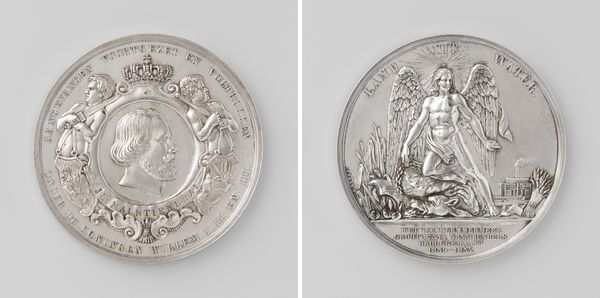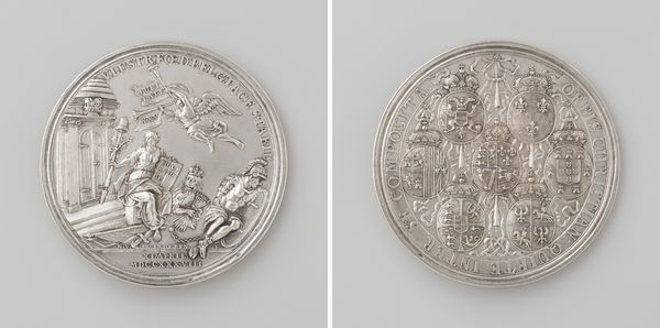 Curator: This metalwork from 1714, entitled "Vrede te Utrecht gesloten tussen Spanje en de Republiek," or "Peace of Utrecht Concluded Between Spain and the Republic" by Daniel Drappentier, is certainly captivating. My first impression? It feels like a whisper of a grand historical moment captured in miniature. Editor: Indeed. The engraving on this piece gives it such remarkable detail, doesn't it? Look at the way light and shadow play across the allegorical figure seated on the left side of one face. Given the title, it's hard not to immediately see it as a claim about Dutch-Spanish power dynamics, and broader conversations around colonialism. Curator: Exactly. The choice of allegory is crucial here. She's not just any figure, but a symbolic embodiment of peace. The placement of the heraldic shield, cannons and sailing ship all give the symbol weight and context in understanding both Dutch ambition and, perhaps, the cost of peace itself. What do you see in its composition? Editor: It is a striking combination. I appreciate the two sides, particularly in how they play against each other with similar elements. For example, you have an allegorical representation of power on one face while, on the opposite, an overt expression of hopeful imagery with the dove and celebratory language that circles it. It brings an important structural contrast between how it presents what each nation state thinks of its place and the resulting relationship of power. Curator: And the choice of metal is no accident. Metal's durability echoes the desire for lasting peace. The choice of Baroque and Realist styles also reinforces its authority through hyper-detailed accuracy alongside stylized figures. And think about Utrecht itself—as a physical site, as a concept of achieving concord. Editor: Considering Drappentier's position in contemporary society, one also must examine what this "peace" would mean, and to whom. Peace might mean something very different for the colonizer versus those under colonial control. What might that have meant for the subjects under Spanish rule? Curator: Precisely! It becomes more than a celebration of peace. It urges us to ask crucial questions about the social costs that get masked within notions like peace, especially considering its history of inequality between colonial power. Editor: Absolutely. It seems a testament to formal artistry alongside a critical lens to prompt interrogation rather than simple acceptance. Curator: Thank you for drawing this out into such nuance; It adds dimensions of a historic piece that makes it far more resonant for the current viewer.