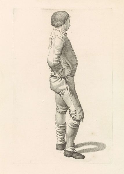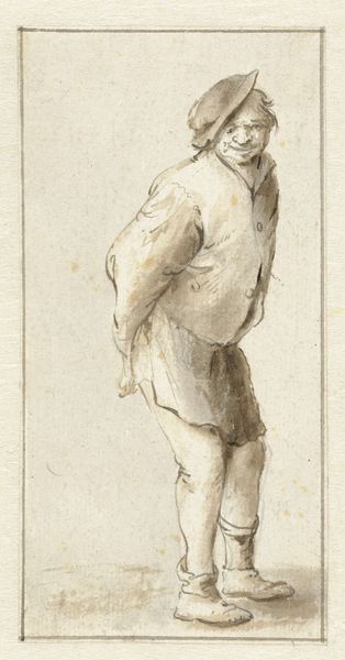 Editor: This is "A Standing Peasant Boy in Clogs" by Nicolai Abildgaard, created sometime between 1743 and 1809. It's a pen and ink drawing currently housed at the SMK in Copenhagen. The subject has a somewhat detached and sullen air, don't you think? How would you interpret this work, considering the materials used and the period in which it was created? Curator: Well, first, consider the readily available materials. Pen and ink were economical and widely accessible, making art production possible for a broader spectrum of society. How might that impact the representation of peasantry in art? Editor: I suppose it makes it more likely that someone like Abildgaard would choose a subject from everyday life rather than a historical or mythological figure. Curator: Exactly. The material reality allows for, even encourages, depictions of common labor and the realities of rural existence. Notice the clogs—wooden footwear indicative of working-class status and manual labor. The very act of drawing him, highlighting this choice of clothing, becomes a commentary on social hierarchy and material conditions. What do you make of his pose? Editor: Arms crossed, leaning slightly. Maybe a sign of defensiveness or simply being resigned to his position? Curator: Precisely. This stance, rendered using cheap and available materials, allows for a discourse on the subject’s position in society. It encourages consideration of class distinctions, and who can afford to be represented, and how, in artworks. This drawing then prompts a discussion about labour, tools, social mobility and what it meant to be working-class in 18th century Denmark. Editor: So, the very materials themselves influence the artistic choices and the social commentary within the work. I hadn’t thought of it that way before. Curator: Thinking about material production and context adds depth to our understanding of art.