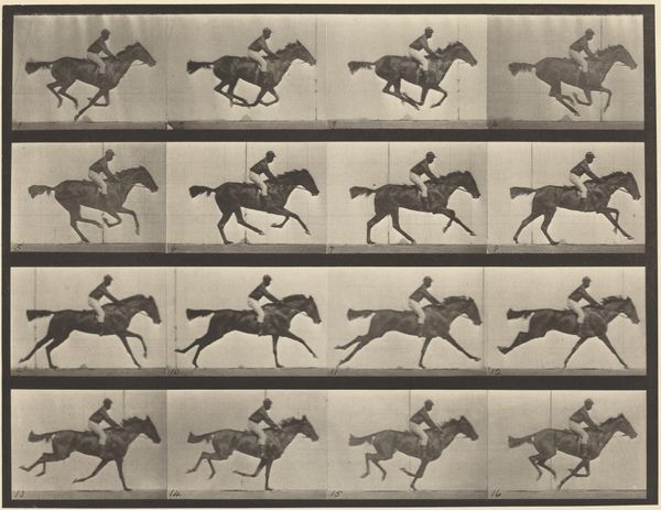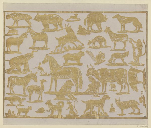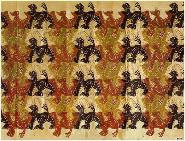 Curator: "Metamorphosis III," this is excerpt five, a print made by M.C. Escher in 1968. It's quite long and narrow, printed with the intaglio technique, depicting several animals. It is rendered in monochrome, graphic, and reminiscent of post-impressionism. Editor: What strikes me is the regimented yet dreamlike quality, a patterned march into the surreal. The strong contrasts draw you in. It is interesting to observe how his fish gradually morph into horses! Curator: Yes, it encapsulates Escher's fascination with transformation. The fish, often symbols of the unconscious and fluidity, shift into the earthbound horse, representing perhaps rationality or even the mundane. Editor: Interesting observation. Thinking of historical precedents, I cannot help but see resonances with the sociopolitical moment of '68, with themes of changing social orders and blurred boundaries that feel relevant. This was also during second-wave feminism, with its concern of liberation of women to live as autonomous persons—Escher challenges this traditional association, perhaps unintentionally. Curator: Very interesting to contextualize in that time period. Beyond politics, though, the symbolic weight remains powerful, speaking to internal psychological processes. The black and white scheme heightens the effect. One cannot stop to observe and examine how he takes one geometric pattern and little by little transform its meaning! Editor: Absolutely. And this process of metamorphosis itself is culturally charged. The transition reflects our own perpetual change of identity. Here we can examine how he took patterns from animal depiction and turned them around, like the birds turning to tessellated shapes. This transition creates not only a geometric change but a narrative. Curator: A journey of identity that's beautifully, if methodically, visualized. Its methodical aspect becomes itself a point of reflection about patterns, geometric repetitions that shape human thought through imposed conventions. Editor: Agreed. Thinking about visual transitions can empower us with a certain cultural memory of imposed conventions to resist structures and be open to our potential transformations! Curator: A very inspiring piece by Escher. I am captivated. Editor: Me too; it’s left me pondering the shifting shapes of the world around us.