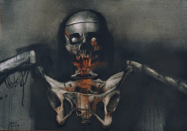 Editor: Right, next up we have 'Man Caught Up with a Yellow Object' by John Latham. It's… intense! All those blurred edges and that figure feels really trapped. What jumps out at you about this? Curator: Trapped is a great word. For me, it feels like a visual echo of the anxieties of the atomic age. That yellow object could be the sun, or something far more sinister. See how the black paint almost suffocates the figure? It’s like a memory struggling to surface, distorted by fear. What do you think? Editor: Wow, I didn't think of that, but the atomic age makes sense with that yellow orb. I see the struggle now in the brushstrokes. Thanks! Curator: My pleasure! It's always rewarding to see a piece in a new light.