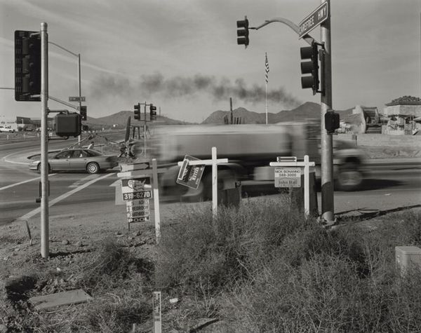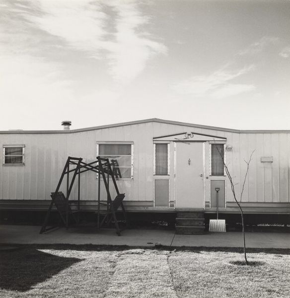 Editor: Robert Adams' "New housing, view of Pikes Peak," taken in 1968, is a gelatin-silver print depicting a rather ordinary house with mountains in the background. There’s something unsettling about its starkness, almost like it's staged. What do you see in this piece? Curator: This image encapsulates a pivotal moment in American history, reflecting the rapid suburbanization of the West and its impact on the environment and social fabric. Adams' work critiques the romantic ideal of the landscape. It also prompts questions about whose narratives are privileged in shaping our understanding of place. Consider the monochrome palette, divesting the scene of color – does that amplify a sense of uniformity or loss, perhaps even alienation, linked to these new housing developments? Editor: I hadn’t thought about the lack of color contributing to that sense of unease, but it makes sense. So it’s not just a picture of a house but a commentary on something larger? Curator: Precisely. Adams situates this seemingly mundane scene within a broader context of capitalist expansion and environmental degradation. The view of Pikes Peak in the distance—a traditional symbol of the American West—becomes almost ironic, a beautiful natural landmark overshadowed by human development. How do you think Adams challenges conventional landscape photography through this juxtaposition? Editor: I see what you mean. Instead of glorifying nature, it’s showing us how we're changing it, maybe not always for the better. It makes you question the American dream a bit. Curator: Absolutely. And questioning those narratives is crucial. Thinking about whose dream is being represented here and at what cost? Adams compels us to engage critically with these complex issues of land use, social change, and our relationship with the environment. Editor: It's amazing how a simple photograph can hold so much meaning and spark such important conversations. I’ll definitely look at landscape photography differently now. Curator: Exactly! Hopefully you’ll think about the historical and social contexts behind them and start to dig into those complicated issues.