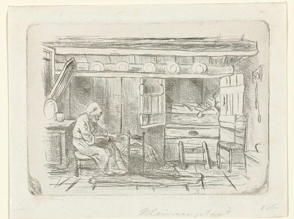 Louis Aubert created this drawing of a kitchen scene with a girl frying pancakes in an unknown time and place. The subject, a simple kitchen interior, provides a glimpse into the domestic life of the past. The sketch, with its attention to the details of kitchenware and the working girl, might reflect the values of the rising middle class, who found charm and virtue in everyday scenes. What's curious is that the drawing doesn't overly sentimentalize its subject, which suggests a modern impulse to capture life as it is, work and all. To fully understand this image, we might want to delve into the social history of domestic labor, the role of women in the household, and the changing attitudes toward work and leisure. We can also examine the institutional history of art academies and their influence on artistic taste. This kind of research helps us to see art as something deeply embedded in the fabric of social life.