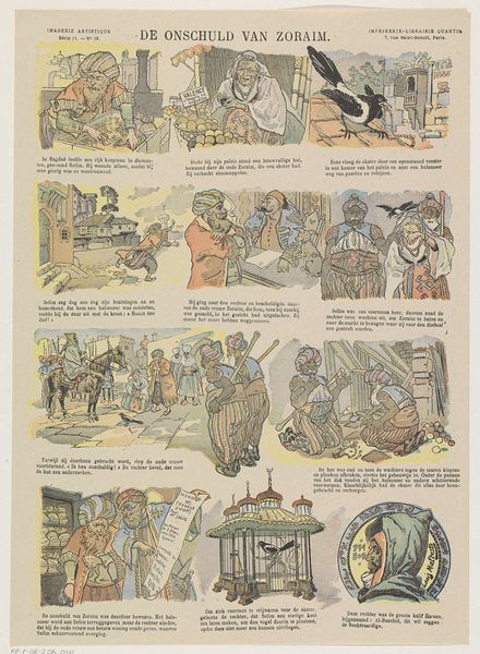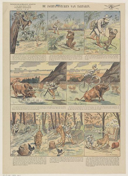 This is a reproduction print titled 'De ongehoorzame knaap', presented in a comic strip format. Its composition is structured into twelve distinct panels, each depicting a scene with consistent characters against zoo enclosures. The artist employs a palette of subdued colors to illustrate the narrative. Each panel functions as a semiotic unit, utilizing both visual and textual elements to construct the story. The formal arrangement of panels encourages a sequential reading, much like a text. This layout challenges the conventional understanding of a singular pictorial space. The images and texts work together to create a coherent and engaging visual story, and destabilize traditional art forms. Note how the artist uses structure to guide the viewer through a narrative and invites us to consider how the arrangement and sequence of images can convey meaning in ways that transcend individual scenes.