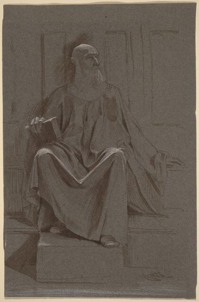 Editor: This is "Figure Study for ‘The Death of Socrates’" from around 1786 or '87, by Jacques Louis David. It’s a drawing, charcoal and pencil I think. The figure has such a calm pose, really dignified, but also there's an incompleteness... it's a study, after all. What grabs you when you look at it? Curator: Well, first off, that grid showing through! It gives away the artist's process in such an honest way. It whispers of calculation, of David’s absolute commitment to perfect proportion, and a controlled composition, true to the Neoclassical spirit. Can you almost feel David thinking about idealizing the male form to show intellect and morality? Editor: Yeah, I can see that. So it’s not just about the person of Socrates, but what he represents? Curator: Precisely! Look at how the light falls, almost dramatically highlighting the drape of the cloth and how it is deliberately used to convey gravitas. Consider too that the Death of Socrates itself is, perhaps controversially, considered an endorsement of revolutionary virtue against corrupt authority... The more perfect Socrates appears, the stronger that message becomes. Now, is this a portrait, or the figurehead of a philosophy? Editor: So David’s not just drawing a picture; he’s making a statement. That's amazing! I always just assumed preliminary studies were, like, sketches, nothing more. Curator: Oh, these glimpses behind the curtain can be far more telling. They remind us that even masters grapple with the mundane aspects of creation before the brilliance fully ignites. Editor: That gives me a whole new respect for the process, not just the final product. Curator: Art-making, truly! Don’t you feel honored to be witnessing it?