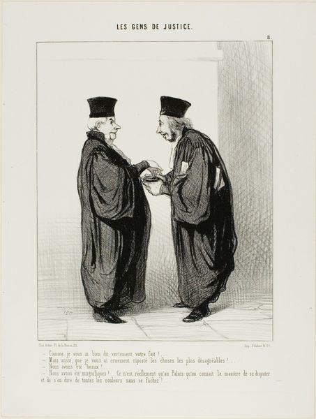 This lithograph by Honoré Daumier, from his series “Les Avocats Et Les Plaideurs”, presents two lawyers after settling a marital dispute. Daumier created this series during a period of significant social and political change in France, reflecting the shifting dynamics within family structures and legal systems. The print encapsulates the intersection of gender, class, and legal power, offering a critique of the economic realities faced by women within marriage. With the sardonic caption, Daumier draws attention to the emotional toll of protracted legal battles, and comments on the financial strain such proceedings placed on families. Daumier was known for his satirical commentary on the bourgeoisie, but here, we see an earlier approach to the theme of social injustice. The artist invites us to consider the emotional weight of financial dependence and marital conflict. While Daumier's figures may seem like caricatures, they illuminate deeper truths about the human condition.