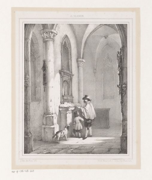 Curator: Here we have Johannes Lodewijk Riedel’s “Kerkinterieur,” an engraving that dates from 1844 to 1845. The style seems to bridge realism with Romantic sensibilities. What catches your eye? Editor: Well, the scale. It's as though the church’s interior is bearing down. All those grey, weighty architectural details looming over those small figures… it evokes a powerful feeling of introspection, maybe even solitude. Curator: Indeed, Riedel uses linear perspective to amplify the interior’s height, emphasizing the spatial relationship between the figures and the architecture. Observe how the light enters and how it articulates the vaulted ceiling. The composition really directs our gaze. Editor: You're right; the light feels deliberate, almost theatrical. See how it catches on the ornate structure in the foreground but fades softly as we move further into the church, creating depth and highlighting the scene's quiet, meditative mood? It’s almost like the architecture itself is a character in this silent drama. Curator: Absolutely. Riedel captures a very specific atmosphere here, one infused with both religious reverence and genre-painting’s everyday detail. Notice, for instance, the meticulous rendering of the architectural elements against the subtle characterisation of each person present. It evokes a feeling that aligns both spiritual awe with grounded realism. Editor: It really makes you think about the layers of meaning in a sacred space, how individual stories play out under the grand gaze of architecture. I like the way the image manages to suggest the individual amid something ancient, imposing and perhaps, indifferent. Curator: A delicate balance. Editor: That, it certainly is. Curator: Yes, Johannes Lodewijk Riedel, manages, through light, and line, to construct a scene resonating the intersection of grandeur and intimacy. A space for collective faith as well as private contemplation. Editor: It makes you wonder what unspoken prayers are echoing within those stone walls. Thank you!