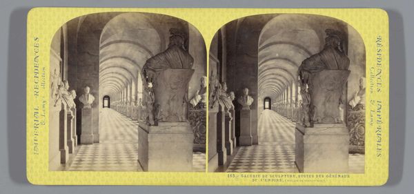 Editor: Here we have Hippolyte Jouvin’s "Wandelgang in de Moschee im Schwetzinger Schlossgarten, Duitsland" – a gelatin silver print taken sometime between 1860 and 1865. The linear perspective is so striking. It almost feels like the architecture is receding infinitely. What formal elements stand out to you? Curator: The composition’s reliance on linear perspective is undeniably its dominant feature. Observe how the receding columns and arches create a powerful illusion of depth. Jouvin masterfully utilizes line, both actual and implied, to draw the viewer's eye towards the vanishing point. Note the repetition of the architectural elements – how does this affect the overall rhythm and balance? Editor: It feels very ordered and intentional, almost mathematical in its precision. But it also seems a bit…stark? Curator: Indeed. The tonal range, though subtle, contributes significantly to the overall mood. The limited palette of sepia tones flattens the image somewhat and lends it an austere, almost melancholic quality. Consider how the light interacts with these forms – where are the darkest shadows, and what does this suggest about the light source and its effect on the architecture? Editor: The shadows mostly fall to the sides, giving the columns dimension and guiding you towards that distant light. Curator: Precisely. It's a carefully orchestrated interplay of light and shadow, isn't it? The architectonic elements aren’t mere depictions, but rather studies of structure and composition through perspectival design. Did anything come to mind while contemplating the artwork? Editor: It's helped me understand the important connection between lines, light, and dimension. I'll definitely look at architectural works differently now. Curator: Indeed. It's a fascinating reminder of how technique can create powerful optical illusions and evoke distinct emotional responses.