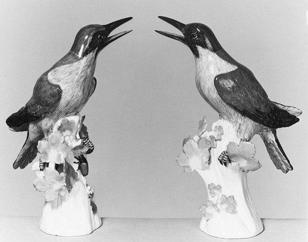Curator: These delicate figurines, dating from 1735 to 1745, are titled "Goldfinch (one of a pair)" and were created by the Meissen Manufactory. They are beautiful examples of Rococo porcelain sculpture. What strikes you first about them? Editor: Their stillness, actually. They seem frozen in time, embodying a sense of arrested beauty. The monochrome presentation emphasizes form and texture, like classical statuary re-imagined. I find this slightly unsettling. Curator: That unsettling feeling, I suspect, is linked to their original function within courtly culture. Meissen porcelain was deeply implicated in displays of wealth and power. Imagine these birds as elements of an elaborate table centerpiece, proclaiming the owner's refined taste and global reach. Editor: So, it’s not just art for art's sake, but a performance of privilege. What about the Goldfinch itself, was that symbolic in any way? Birds often carry heavier cultural meaning than we realize. Curator: Precisely. Goldfinches were often associated with the Passion of Christ, due to the myth that they pulled thorns from his crown. However, in a secular context, such as here at Meissen, they might represent merely beauty or refinement, signaling a separation from religious spheres. They mark wealth and status. Editor: Which further alienates them, I feel. To take something inherently free – a bird – and transform it into an object of consumption… I'm struck by the tension between the naturalism they strive for and the artifice they embody. Are they free? Or are they decoration, commodities made to sit pretty for a privileged few? Curator: That tension is absolutely central. Meissen thrived by mimicking nature with industrial precision. Examining its historical and cultural context makes you realize it reflects not only artistic skill, but also complex hierarchies of power and the emergence of consumer culture. Editor: Right, understanding that these were not just beautiful objects, but emblems in a bigger narrative, provides a deeper perspective than merely aesthetic appreciation ever could. Curator: I agree, it gives you so much more to think about. Editor: Exactly!