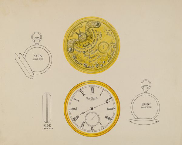 Here we have Harry G. Aberdeen's "Sporting Watch". This seems to be an illustration done with watercolor or gouache. It’s got that flat, graphic feel that’s so different from the illusionism we expect. It’s like a diagram, a flat design. Look at the golden casing. It's outlined with a thin, unwavering line, and filled in with a wash that's pretty even, not much variation. It's like he's saying, "This is gold," but without any of the shimmer or depth we associate with it. The hands of the watch are stark, black lines, cutting across the face with geometric precision, pointing to times that are not real. Aberdeen’s piece reminds me of some of Ed Ruscha's deadpan depictions of objects, taking something ordinary and presenting it in a way that's both familiar and alienating. It makes me think about how we relate to objects, and how art can shift our perspective. The lack of depth and the precision create this sense of detachment, as if it's not just a watch, but an idea of a watch.