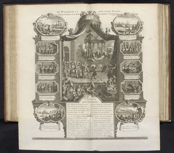 Curator: This engraving from the late 16th century, entitled "Theater van de Vrede (interieur)," which translates to "Theater of Peace (interior)," produced circa 1594-1595 by Pieter van der Borcht the Elder, immediately evokes a sense of grandeur. Editor: Yes, my immediate impression is of meticulously organized chaos, or rather, a structural dance. Look at the radiating lines of the seating contrasted with the static figures. The visual perspective almost hyperbolizes the spatial arrangement. Curator: The subject matter also speaks volumes about the cultural anxieties and aspirations of the time. The “Theater of Peace” is not merely a building; it's a symbolic space, representative of a desired utopian social order. What we're viewing can be contextualized with rising humanism—hope—across Europe and perhaps an indictment against protracted imperial projects. Editor: Precisely. Van der Borcht utilizes the receding planes of the theater to amplify the idea of perspective – both visually and conceptually. See how the artist's rendering of depth charges the scene with meaning. Curator: And how the tiers upon tiers of figures create a social panorama. The people are representations of various societal roles all in this place together. Notice they are presented with attributes that help denote which function or place each is to occupy in the cultural memory that such an image sustains. They are archetypes of their civic responsibilities. Editor: Absolutely. He utilizes symbolism deeply embedded in Northern Renaissance thought and style—the overall architectural rendering being almost Escher-like. Yet, if one scrutinizes the geometric lines and careful gradation of shading, it presents a complex system that balances structure and suggestion, reflecting human aspirations of perfection with known flawed approaches. Curator: It is, indeed, a powerful fusion of artistry and ideology. I am continually struck by how deeply ingrained notions of societal harmony were articulated via such architecturally fascinating representations. Editor: It makes one consider how our own contemporary architecture—or depictions of it—mirrors or deviates from this quest for visible, material utopia. Thanks, this print left me more meditative and appreciative of the intricacies and paradoxes that artists render so palpable in architectural and social space.