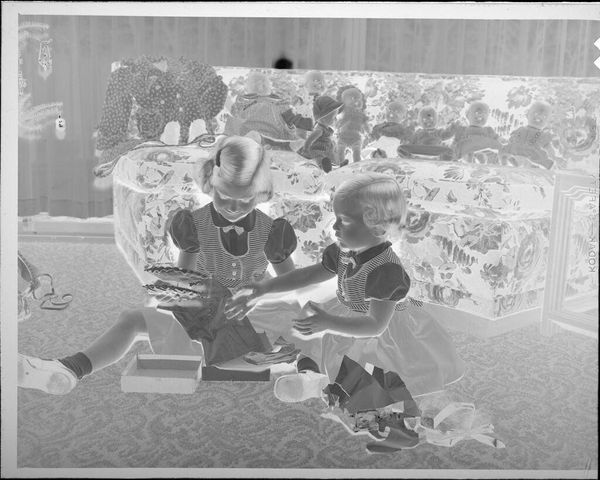 Editor: This is an intriguing, undated photograph by Lucian and Mary Brown, currently held at the Harvard Art Museums. The composition, with its stark contrasts, creates a rather unsettling mood. What is your interpretation of this piece? Curator: The photograph presents a fascinating study in contrasts. Note the tonal range, how the artists have manipulated light and shadow to create depth and define form. The stark juxtaposition of the subjects against the background is striking, isn't it? It almost creates a sense of unease. Editor: I see what you mean. The high contrast flattens the image, making the figures seem almost ghostly. Curator: Precisely. And the positioning of the figures within the frame—the adult dominating the composition while the child is relegated to the side. What significance might that hold? Editor: Perhaps a power dynamic is at play? Thank you for sharing your perspective! Curator: Indeed, exploring the visual elements allows us a deeper understanding. My pleasure!