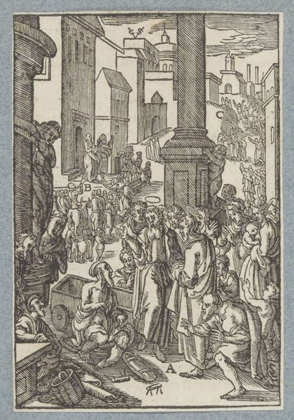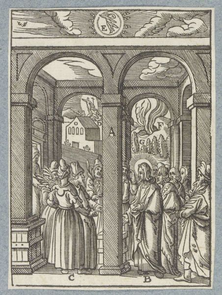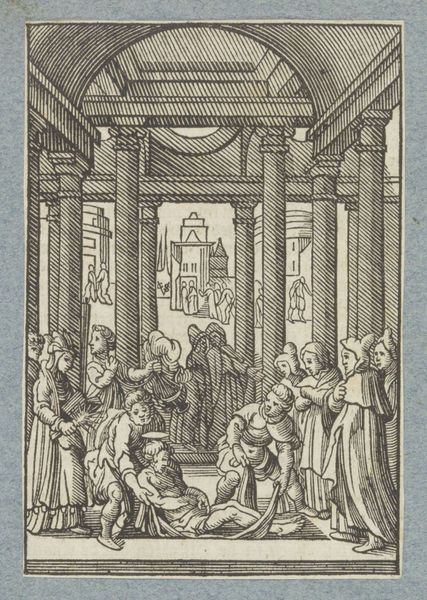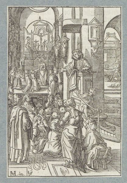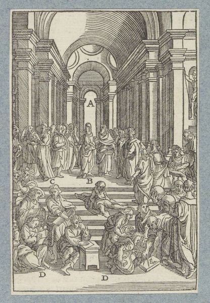 Editor: We’re looking at "Presentation in the Temple," an engraving made around 1629 by Christoffel van Sichem II. The architectural detail is fascinating, yet something about the figures feels a bit stiff, almost like actors on a stage. What catches your eye in this print? Curator: You know, “stiff” is interesting, because there's also a kind of fervent energy here. It's like everyone is leaning in, literally and figuratively. All those lines converging towards the center make me think of how the story focuses on new beginnings. The somewhat heavy line work reminds us that everything’s grounded in a tangible reality. Does the temple remind you of other spaces, too? Editor: Definitely. The pillars remind me of Roman architecture. But the details… they have an almost gothic flair. So what was Sichem II trying to say, pulling from different styles? Curator: It's an interesting melange, isn't it? And what of the setting? A lot of engravings depict open settings, and landscapes; here, the Temple is like an interior state of mind, not just a historical place. What do you think he was going for? Editor: Hmm... So instead of realism, Sichem II used architectural cues to heighten the story's impact? Curator: Precisely! The different periods might show an ageless theme; that spirituality transcends temporal fashion. So, as much as it might seem historically “accurate,” it's all working together to build a sort of, dare I say, soul-scape? What does the notion do for you? Editor: "Soul-scape"... I love that! Seeing the print now, it has a depth that goes beyond just the religious scene depicted. Thank you. Curator: My pleasure! The piece whispers, and we’ve learned to listen. A fascinating journey for the eyes *and* the soul!