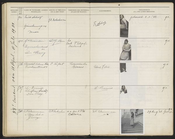 Editor: This is “Blad 99 uit Stamboek van de leerlingen der Koloniale School voor Meisjes en Vrouwen te 's-Gravenhage deel I (1921-1929),” possibly from 1929. It’s a mixed-media piece combining collage, prints, paper, and photography. It feels like an official record, but with these intimate photographic portraits inserted. What strikes you most about this work? Curator: What I find most compelling is the way this seemingly bureaucratic document hints at the complex realities of Dutch colonialism. These are pages from a registry of students at a colonial school for girls and women, likely intended to train them for service within the colonial system. The neat rows and columns attempt to impose order, but the individual portraits resist complete assimilation. Editor: Resist, how? Curator: Consider the gaze of the women in these photos. Are they passively accepting their role, or is there a hint of defiance, of a complex inner life that resists the objectification inherent in colonial documentation? Also, look closely at the photograph of the group. What narratives might they carry? Are their garments of mixed cultural references? Editor: I see it now. The contrast between the rigid structure of the ledger and the individuality captured in the photos really brings the human element to the forefront. It makes you wonder about their lives beyond this document. What were their aspirations and did they get fulfilled or were squashed? Curator: Exactly. And that tension—between the colonial project's desire for control and the inherent resistance of individual identity—is what makes this work so powerful, prompting us to confront uncomfortable questions about the legacies of colonialism and its impact on individual lives. Editor: I see so many layers here. It’s a stark reminder of the power dynamics at play and the importance of remembering individual stories within broader historical narratives. Curator: Indeed. By looking closely at what is included, what is omitted, and how these women chose to represent themselves, we can start to understand this time period with all its human nuances.