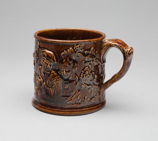 This mug was made by Isaac Spiegel, circa 1870, out of glazed earthenware. It is currently housed in the Metropolitan Museum of Art. The vessel's body presents itself as a gnarled tree trunk, its rough texture emphasized by a deep brown glaze, pooling and streaking to mimic natural imperfections. Attached to this trunk is a grotesque mask of a bearded man, possibly a satyr from classical mythology, complete with vines and fruit intertwined in his hair. The piece engages in a semiotic interplay between nature and culture. The tree-trunk form and satyr allude to the untamed wilderness, while the crafted glaze and practical function represent human artifice and control. This tension is further highlighted by the mug's utilitarian design, which clashes with the wild, Dionysian imagery. The mug destabilizes conventional ideas about nature, beauty, and civilization by merging them into a single object. The choice of earthenware grounds the mug in materiality, yet the rich glaze elevates it beyond mere function.