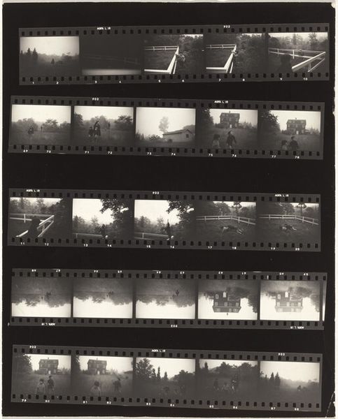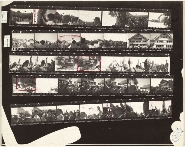 Curator: Let's talk about Robert Frank's "Nixon Campaign 3," a gelatin silver print from 1960. My first impression is one of almost overwhelming documentation. It’s raw. Editor: Overwhelming is a good word. I'm immediately drawn to the formal composition itself. The rigid grid of frames, like a filmstrip, presents a fractured narrative, emphasizing the medium's role in shaping our perception. Curator: Absolutely, and it’s crucial to consider the political context. Frank was known for critiquing power structures. Think about the social landscape of 1960—the Cold War, anxieties around national identity—and how Nixon embodied a certain conservative ideal. This layout gives insight into how Frank experienced, saw, and felt the political machine at work. The outtakes. The rawness. Editor: And what of Nixon himself? Note the various perspectives; some frames show Nixon directly addressing the crowd, while others capture him from odd angles, almost distorted. Is it a commentary on his carefully constructed image? I'm thinking about Lacan’s concept of the gaze and how power is visualized through specific aesthetic choices. Curator: I believe that's right. Those seemingly unintentional compositions speak volumes about control and manipulation of the campaign. Who controls the narrative? Also consider how different demographics in America would have received images of Nixon during that time, based on where they stood politically, economically, or in terms of race and gender. The meaning differs greatly based on your position. Editor: That resonates. Beyond political messaging, I am noticing how light plays across the photographic emulsion, the grain adding texture and depth. Does this suggest an unease? Curator: I think the uneasy feeling comes through intentionally. It’s a period rife with political division, and Frank captures that tension beautifully through the composition as well as his personal artistic choices. Editor: Seeing it this way opens up more space for thoughtful, and crucial interpretations. Curator: Indeed. Frank pushes us to confront the uncomfortable truths embedded in political imagery.