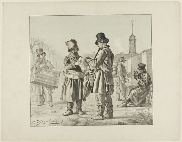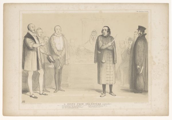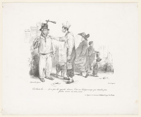 This print, "Drie mannen in gesprek," by Aubert & Junca, presents a scene rendered in delicate lines and subtle tonal variations. The composition, seemingly simple, invites deeper consideration. Three figures dominate the foreground: their postures and attire suggest a staged encounter. Each figure's stance, meticulously rendered, conveys a distinct presence and perhaps a social commentary. Note how the linear quality of the print enhances the contours of their clothing and the surrounding landscape, contributing to a sense of depth and spatial arrangement. The backdrop, a sketch of architectural elements and natural forms, adds layers to the narrative. These structural elements destabilize a fixed meaning; their arrangement suggests a space of transition, inviting viewers to question the nature of the interaction among the men. The formal qualities of "Drie mannen in gesprek" extend beyond mere representation; it challenges us to consider the social and philosophical underpinnings of human interaction, capturing a moment suspended between reality and representation.