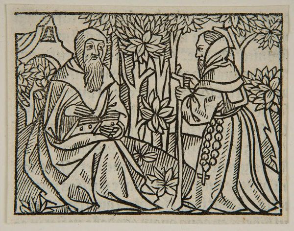 Editor: This is Illustration VI, an undated work by an anonymous artist, housed at the Harvard Art Museums. It feels like a snapshot of medieval domestic life. What do you see in this piece that I might be missing? Curator: This image offers a glimpse into the power dynamics of the era. The central male figure, likely the patriarch, directs the scene with a pointed finger. Consider the woman’s position and the servants attending to the table. What does their placement suggest about their roles and status within this social structure? Editor: So it’s not just a scene of daily life, but also a commentary on social hierarchy? Curator: Precisely. This illustration invites us to reflect on the historical and social structures that defined gender roles and class distinctions. What can we learn from this depiction about the unseen labor that sustains these hierarchies? Editor: That's a powerful perspective. It's made me see the image in a new light. Curator: Indeed. Art often serves as a mirror reflecting not only the aesthetics of a period but also its underlying ideologies.