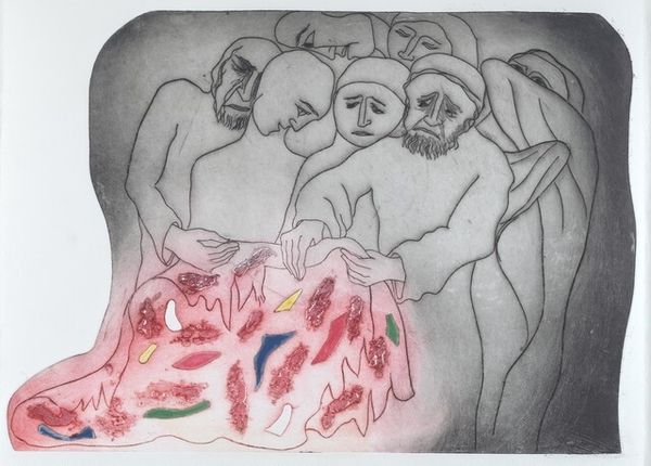Curator: This is "Joseph and His Brothers XVI," an engraving from 1966 by Peter Lipman-Wulf. There’s such a sense of anguish in the upward reaching gestures. What strikes you most about this piece? Editor: The composition, first off. There's a clear division between the frenetic group on the left and the solitary figure on the right, also that yellow-and-white "squares" which I can't make sense of. What is the meaning of it all? Curator: Consider the tonal values—the artist uses chiaroscuro to create depth, highlighting the emotional weight of each figure. Do you observe how the darker shades create a somber atmosphere, while the areas with less tonality point to "holes" inside the right-side figure, creating an emphasis through void? Editor: I do. The dark and light definitely create that sense of division, a "before" and "after," but what are those yellow spots there for? It looks like it’s tearing away to show a… a new self, perhaps? Curator: Interesting. That "new self" may not be the ultimate answer but let’s engage with its materiality. Engraving is a subtractive process. What does the removal of material from the plate to create this image suggest to you about the narrative? Editor: That there has been some removal too? Like parts have been erased in his life? Joseph has been erased, maybe, from his father's life, represented in the engraving. Curator: Exactly! That process mimics the emotional and physical displacement inherent in the story, underscoring themes of absence and transformation. What do we think is the effect that using simple lines adds to the tone and overall composition? Editor: I can see that by limiting his tonal range to mostly grays and using only some yellows, Lipman-Wulf highlights the turmoil in a somber and direct manner. It almost feels raw, and incomplete, but with meaning to be found. Thanks for shedding light on this technique. Curator: Indeed, the "absence" of colors is itself evocative! Considering art as something greater, a product of the creator himself, the form mirrors its content. The interplay of formal elements like line, tone, and composition offers a rich field of interpretation beyond narrative alone.