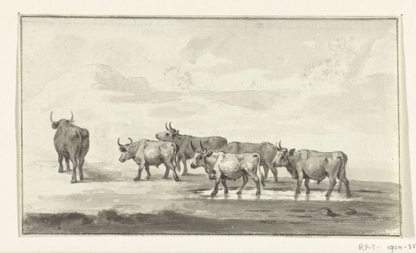 Editor: This drawing by Joseph Louis Leborne, from 1828 or '29, titled "Two Cows and a Shepherdess on a Donkey with Livestock" has such a gentle quality, almost nostalgic. What do you see in this piece beyond its surface depiction? Curator: I see a romanticized vision of rural life, but it’s crucial to ask, for whom? Leborne likely produced this drawing for an urban audience, one perhaps longing for an imagined, simpler past. We must consider how such representations reinforce social hierarchies, obscuring the realities of labor and land ownership within agricultural communities. Who is present, and significantly, who is absent in this idyllic scene? Editor: That's interesting! I hadn't thought about it that way. I was focusing on the relationship between the animals and the shepherdess. Curator: And that relationship itself needs interrogation. How does the image frame the shepherdess's power relative to the animals? Are they portrayed as docile and dependent, thus reinforcing a certain narrative of human control over the natural world? Consider also, the lack of contextual detail; the generalized landscape reinforces the idea of rural life as a blank canvas onto which the urban imagination projects its desires. Do you see it shifting toward art that empowers those actually engaged in agriculture? Editor: I do. So, looking at it now, it makes me question whose story is really being told. The drawing's artistic skill is undeniable, but is it perpetuating an inaccurate vision of that time? Curator: Exactly. It is crucial to analyze art from the past critically, to ask difficult questions about representation, and to seek out narratives that challenge dominant ideologies. Even a seemingly innocent sketch like this speaks volumes about the social and political landscape of its time. Editor: This has given me a completely new way to interpret historical art. It feels like there is much more that lies under the surface than I knew.