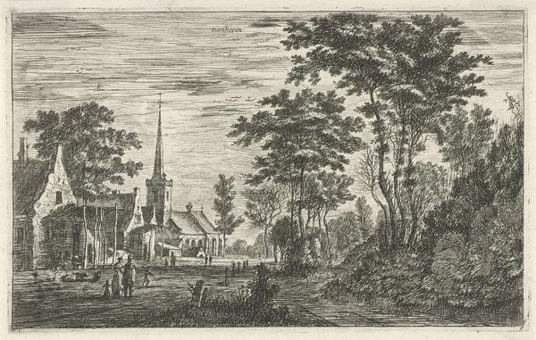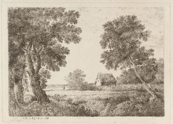 Adrianus Serné created this etching of two houses along a road; we don't know exactly when, but probably in the early 19th century. The character of an etching is so dependent on the labor involved. An etcher like Serné would have covered a copper plate with a waxy ground, then drawn into it with a needle to expose the metal. The whole plate was then immersed in acid, which bit into the lines, creating grooves that would hold ink. The printmaker then burnishes the plate to remove any surface residue before applying ink to its surface with a roller or dabber. The plate is then pressed against paper, resulting in the transfer of ink from plate to paper. The incredible detail here speaks to Serné's patience, his careful observation, and his trained hand. But the subject is equally eloquent: humble buildings, thoroughly embedded in the landscape. It is a testament to the virtues of the everyday. An etching like this invites us to see the world through the eyes of those who made it with their hands.