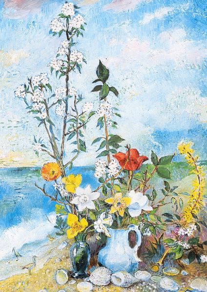 Curator: What a wildly wonderful painting. This is David Burliuk’s “Flowers and Seashells in a Mountain Landscape," painted in 1951. A vibrant, unexpected combination of acrylic and impasto. It practically bounces with color. What do you make of it? Editor: My first thought is defiance. A challenge to conventional landscape, and even still life painting. It's almost aggressively joyful in its colour palette. Curator: Yes! The sheer exuberance gets me. The sunflowers reach like mad toward the sky, those shell are just tossed to the side there on that hill--or a table?--and the mountain range... it’s barely a suggestion. Do you read anything into that? Editor: Absolutely. Consider Burliuk's biography. He was, after all, deeply affected by the politics of his time. We have an avant-garde artist who emigrated from Ukraine to the US. So these playful seashells gain new dimensions. Curator: They’re almost little refugees, stranded on this vibrantly hued, somewhat alien landscape. What do you make of that vivid but odd choice of colour? That bright blue that almost feels artificial under all the pastoral trappings? Editor: Perhaps that electric blue symbolises displacement, or a new environment. It is striking how that mountain, which looms behind the flowers, isn’t stable—or at least not as the flower vase in the centre. What about the tension between what could be construed as 'high art,' represented by oil painting and traditional landscapes, and more 'domestic' elements such as a vase of flowers? Curator: Ooh, good point! The flowers are nature tamed, artful, while the mountain resists easy definition. Even its reflection, down near the foreground. Almost as if to say nature laughs in the face of our human desire for mastery and perfection. This painting is more of a declaration. Editor: Exactly! It feels radical and brave even to this day. The tension between all these seemingly familiar figures opens into much richer socio-political analysis if we view them from Burliuk's historical experience as a Ukrainian migrant. Curator: Well, you’ve certainly bloomed where you were planted today, with some fine, insightful perspective! I’ll never look at a handful of flowers and a pretty mountain landscape quite the same way again. Editor: And for me, a good reminder of the politics always rumbling beneath ostensibly placid surfaces!