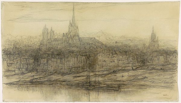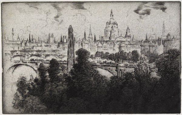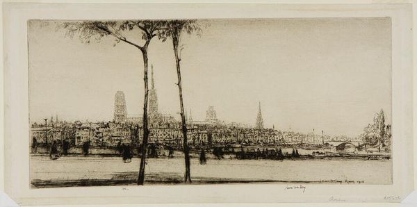 James McBey produced this etching of ‘Rouen’ sometime during his career that spanned the first half of the 20th Century. It pictures a quiet moment in the life of a medieval city that would have already endured centuries of social and political upheaval. The etching depicts the northern French city as seen from across the river, dominated by the imposing presence of its cathedral. The city appears somewhat timeless and still today Rouen remains largely defined by the architecture shown here. The image is divided into zones. The leafless trees on the bank contrast with the towers and spires of the religious buildings in the center. The dark figures on the bank in the foreground create a sense of depth. McBey's choice of subject suggests an appreciation for history and tradition. To fully appreciate a work like this, historians often consult period maps, photographs, and social documents. By examining the work in its historical context we can better understand its meaning and enduring appeal.