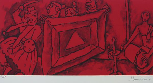 Editor: This is Oleg Holosiy's "White Elephants" from 1991, a mixed-media painting that seems to depict a dreamlike landscape filled with pale elephants under a night sky. It evokes such a surreal and unsettling atmosphere. How do you interpret this work? Curator: Well, the “white elephant” itself carries potent symbolic weight. In some Eastern cultures, it represents rarity, sacredness, even royalty, but Western idioms suggest it's a burdensome, unwanted gift. Holosiy may be playing with these contrasting ideas. Editor: I never thought about that tension before. So, it’s not simply about elephants? Curator: The choice of elephants, traditionally associated with memory and wisdom, also asks us what cultural memories or burdens are present here. And the almost ghostly rendering invites thoughts of loss and forgotten histories. What kind of effect is that figure at the left of the image creating for you? Editor: I find them rather distant, like a removed observer looking at the Elephants who maybe representing forgotten memories. This artwork has some intense contrasts, both conceptually and in the dim shades it employs. I wonder, why Holosiy chose the elephant as a cultural vehicle? Curator: Holosiy, emerging from a Soviet context, may be using the elephants as symbols of something unwieldy or beautiful but ultimately a ‘gift’ with a complicated history for his own culture, maybe Ukrainian Identity after the fall of USSR. Editor: The symbolic richness here is extraordinary, making a deeper and complex reading for an almost monochrome painting. Thank you, that adds layers of meaning! Curator: Indeed, art often serves as a visual bridge to understanding cultural layers, prompting us to see with new eyes.