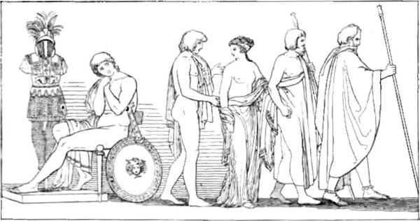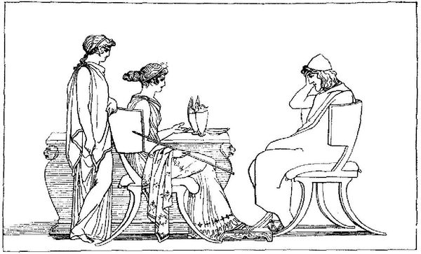 Editor: Here we have John Flaxman’s "Illustration to Odyssey", created in 1793 using ink on paper, showcasing an engraving technique. The stark lines and monochrome palette give it a sense of classical severity, like something found on an ancient Greek vase. What first strikes you when you look at this piece? Curator: The emotional weight conveyed through minimal line work is captivating. Flaxman deliberately adopts the visual language of ancient pottery painting to bring Homer’s epic into the sphere of the domestic and familiar, doesn’t he? We're not just witnessing a scene; we're connecting with a cultural memory. Do you think the scene benefits or suffers being removed from the vase medium and instead exists as ink on paper? Editor: That’s interesting. I hadn’t considered how the medium shifts the impact. Perhaps the paper elevates it, removing it from a functional object to something purely artistic, a conscious engagement with the past. But what about the scene itself? Does anything particular stand out to you in its depiction? Curator: Note how the figures' gestures, though simple, evoke complex feelings of grief, duty, and resignation. This reflects the Neoclassical desire to ennoble, finding universality through specific, identifiable visual references. It speaks to the continuity of human experience. The use of recognizable imagery turns this into more than an illustration; it’s an act of cultural preservation. The image references something innate that is meant to endure beyond this printed image. Editor: So it's like he's trying to tap into these timeless human emotions and make them relevant for his contemporary audience? Curator: Precisely. And even for us today! That simple outline holds layers of history, psychology, and artistic intent. What do you make of that? Editor: I see it as a bridge across centuries, an attempt to keep the epic relevant, almost like a visual echo resonating through time. It really reframes how I look at illustrations; this feels monumental despite its apparent simplicity. Curator: Absolutely, and that’s the power of thoughtful iconology.