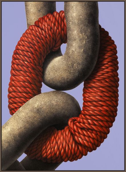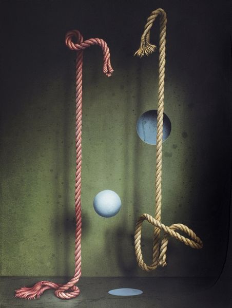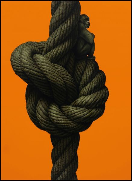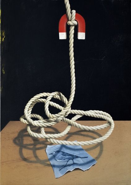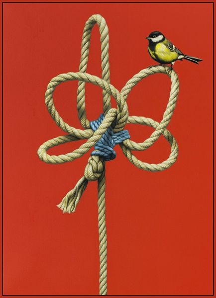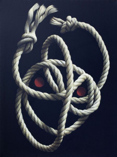 Editor: This is Eckart Hahn’s “dove,” painted in 2017. The composition is so striking with the red rope against the stark black background. It feels both incredibly real and also quite surreal. What do you see in this piece, from your perspective? Curator: It immediately brings to mind the fraught relationship between freedom and constraint. Doves are universally recognized as symbols of peace and liberty. But here, Hahn presents them entangled, almost imprisoned, within a complex network of red rope. This vibrant, almost violent, red hints at passion, anger, or even danger, which clashes sharply with the dove's inherent symbolism. Editor: So, the artist is perhaps commenting on how even peace can be bound by something darker? Curator: Precisely. Think about the sociopolitical landscape of 2017. What issues surrounding freedom and restriction were prominent? What does it mean to depict these symbols – doves, usually representative of liberation – literally tied down? Editor: I remember there being growing discussions on migration and borders... Curator: Exactly! The “dove” then becomes a potent commentary on the paradox of freedom – that it is often an illusion, or accessible only under certain conditions, for certain people. This idea goes far beyond mere surface aesthetics, offering deep implications. Editor: I see it so differently now! It's much more layered than I initially thought. Curator: It’s important to always consider context – not just visual cues but the broader social conversation happening when and where an artwork is made. Editor: This has totally changed my perspective on symbolisim and how to analyse artwork! Thank you!